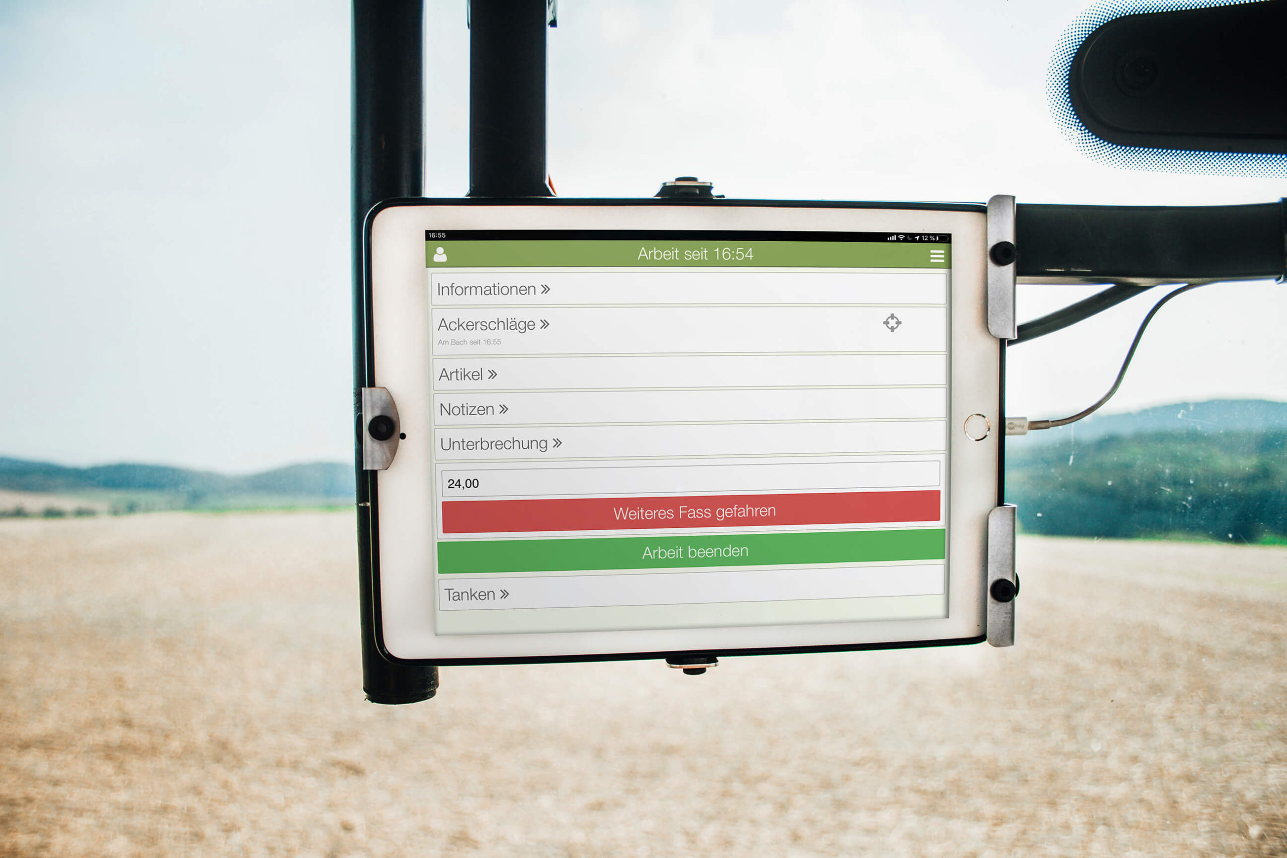 Der landwirtschaftliche Betrieb versorgt mit der Produktion von Stroh und Heu die über 150 Pensionspferde und baut Mais für die betriebseigene Biogasanlage an. Damit die Maschinen entsprechend ausgelastet werden, bieten sie auch Dienstleistungen für andere Landwirte in der Umgebung an. „Viele Reitanlagen in der Umgebung arbeiten mit uns zusammen, die wissen halt, dass wir auch in unserem Interesse viel Wert auf die Qualität von Heu und Stroh legen.“ Jedoch müssen diese erbrachten Leistungen auch abgerechnet werden. Als Grundlage dafür dienten die Notizen, die auf dem Tablet erfasst wurden. Problematisch war allerdings die Aufbewahrung der Tablets auf der Maschine. „Wir haben eigentlich gar nicht nach einer Software gesucht, sondern waren einfach nur begeistert, von den Halterungen für die Tablets, die unser Lohnunternehmer auf seinen Maschinen hatte.“