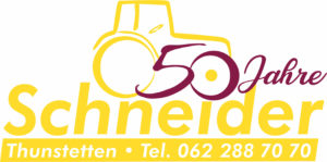 Beim Betreten des Firmengeländes fällt neben dem beeindruckenden Fuhrpark, sofort das freundliche, einladende Büro ins Auge. Es ist modern verglast und mit einer großen, gelben Schlepperskizze beklebt. Auf diesen gelben Schlepper stoßen wir bei Markus Schneider an allen Ecken des Betriebs. Jedes Fahrzeug ist mit dem Logo des Schweizers beklebt und auf einigen Maschinen prangt in diesem Jahr zusätzlich zum „Schneider Thunstetten“ ein großer, weinroter Aufkleber: „50 Jahre“.