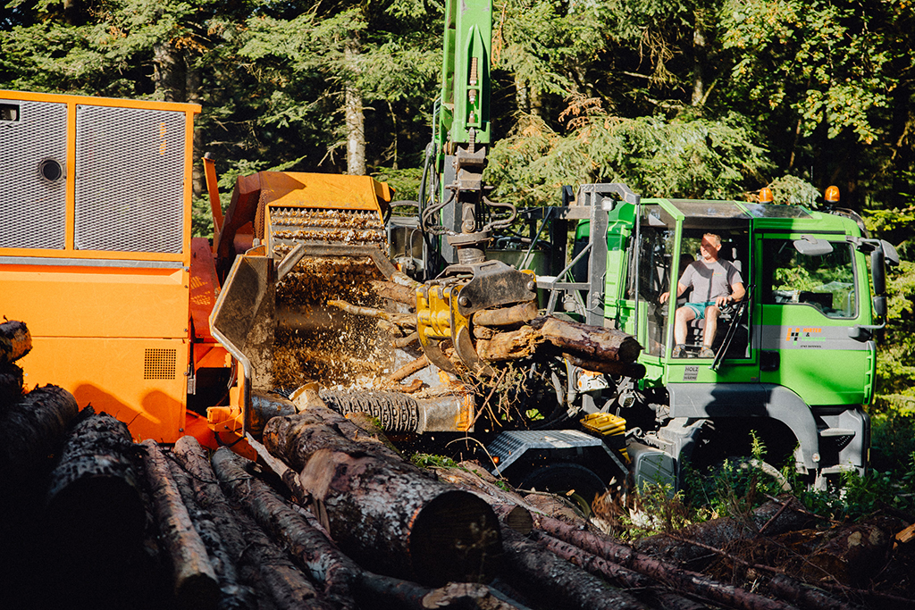 Angefangen hatte der Vater von Freddy Hirter 1961 mit einem klassischen Lohnunternehmen, welches ab 1985 das Holzhacken in das Portfolio aufgenommen hat. Da es keine Maschinen auf dem Markt gab, die die Anforderungen erfüllten, wurden sie kurzerhand in der eigenen Werkstatt entwickelt: „Den Hacker haben wir entworfen, das Aggregat kommt aus Finnland. Den Rest haben wir dann zusammengebaut“, erklärt Freddy Hirter. Die Holzhacker haben einen Zwischenbunker von 10 m³ und können weiterarbeiten, auch wenn gerade kein Transportfahrzeug zur Stelle ist.