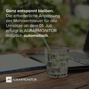 Wir lassen unsere Kunden damit natürlich nicht alleine: Die erforderliche Anpassung der Mehrwertsteuer erfolgt in AGRARMONITOR selbstverständlich automatisch. Für alle in dem betroffenen Zeitraum anfallenden Umsätze werden die reduzierten Steuersätze verwendet.