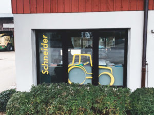 Beim Betreten des Firmengeländes fällt neben dem beeindruckenden Fuhrpark, sofort das freundliche, einladende Büro ins Auge. Es ist modern verglast und mit einer großen, gelben Schlepperskizze beklebt. Auf diesen gelben Schlepper stoßen wir bei Markus Schneider an allen Ecken des Betriebs. Jedes Fahrzeug ist mit dem Logo des Schweizers beklebt und auf einigen Maschinen prangt in diesem Jahr zusätzlich zum „Schneider Thunstetten“ ein großer, weinroter Aufkleber: „50 Jahre“.