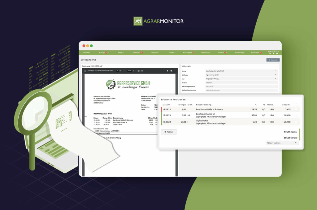 Mit der automatischen Beleganalyse wird die Effektivität im Unternehmen enorm gesteigert, denn Dokumente können nach dem Eingang schnell weiterverarbeitet werden, ohne mühsames, händisches Abtippen von Rechnungsdaten. Die automatische Texterkennung von AGRARMONITOR erkennt und erfasst sofort alle relevanten Rechnungsdaten auf einem gescannten Beleg oder Foto.