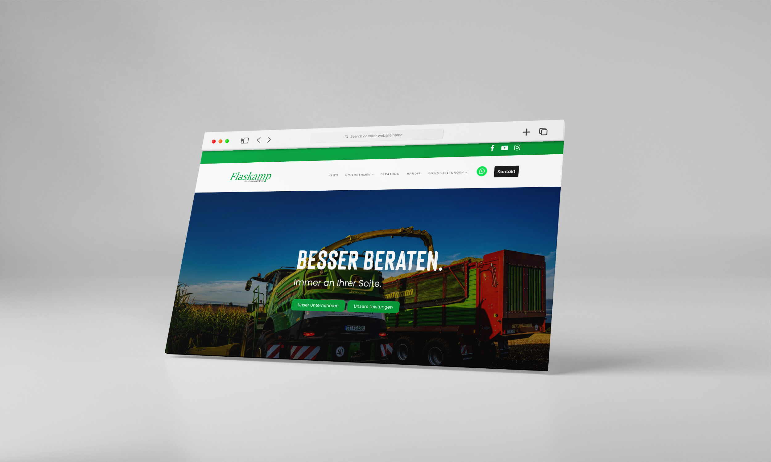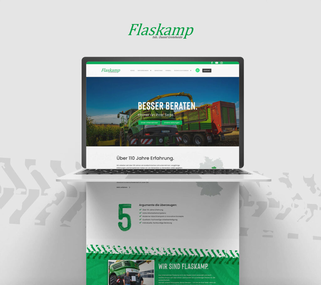 Das Lohnunternehmen Flaskamp aus dem nordrhein-westfälischen Rheda-Wiedenbrück arbeitet seit über 100 Jahren als landtechnisches Lohnunternehmen. Langjährige Erfahrungen und Kompetenzen wurden von Generation zu Generation weitergegeben. Das Team Flaskamp kann mit einen hochmodernen Maschinenpark und kompetenten Mitarbeitern nahezu jede landwirtschaftliche Tätigkeit zuverlässig und pünktlich ausführen.  Die absolute Zufriedenheit des Kunden ist das Ziel rund um Geschäftsführer Daniel Groteheide und den stellvertretenden Betriebsleiter Jannik Brüggershemke.  Die Schwerpunkte des Unternehmens gliedern sich in drei Bereiche: Beratung, Leistungen (Landwirtschaft, Kommunen und Transport) und Handel. Getreu dem Motto „Besser beraten. Immer an Ihrer Seite“ ist das Lohnunternehmen Flaskamp ein kompetenter Ansprechpartner von A-Z.