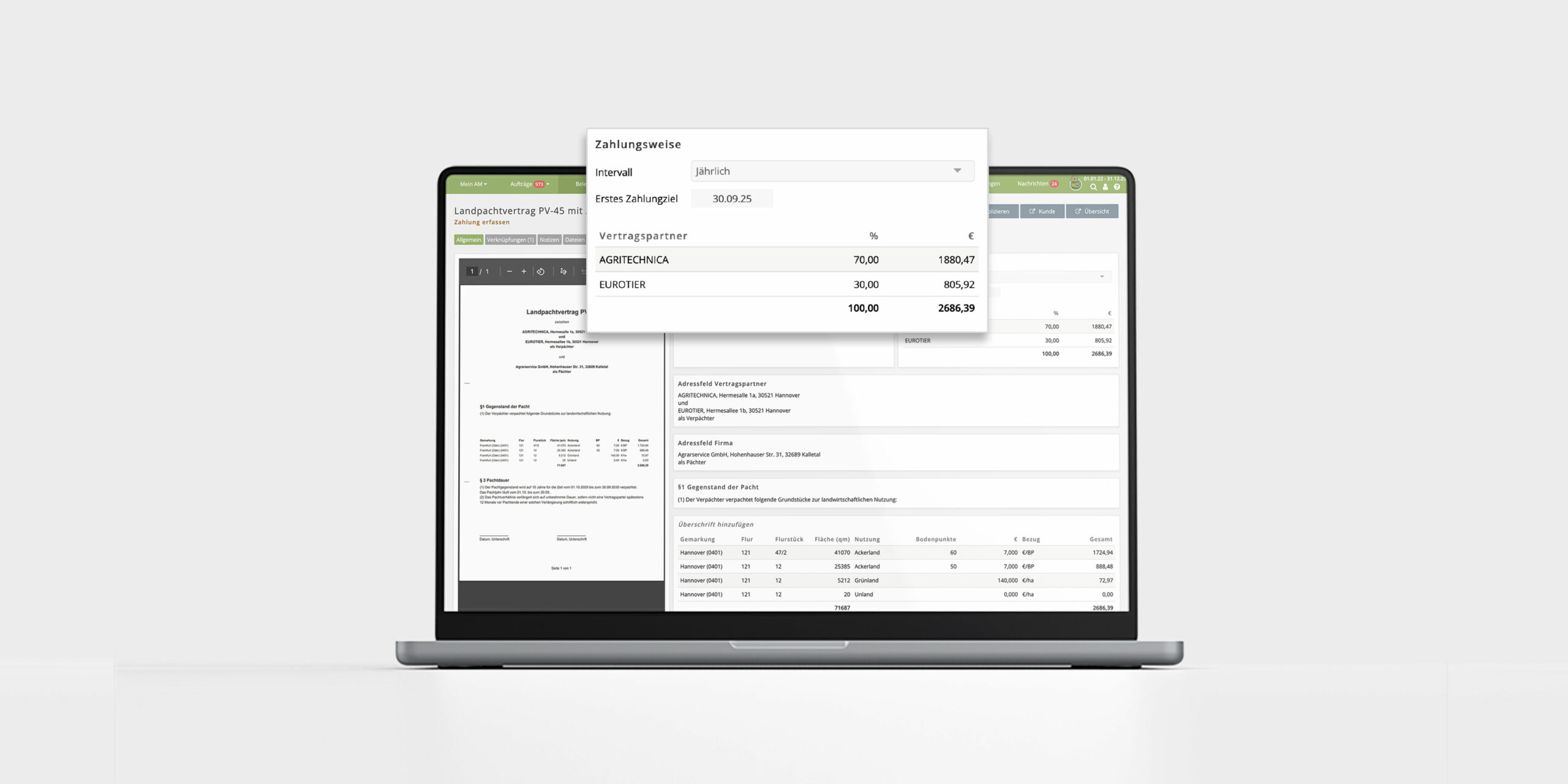 Laufzeiten, Kündigungsfristen und wichtige Termine werden transparent dargestellt. Auf Wunsch erinnert AGRARMONITOR rechtzeitig, damit nichts übersehen wird und Entscheidungen sicher getroffen werden können.