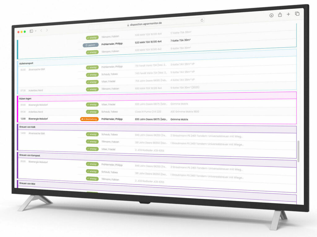Mit der überarbeiteten Disposition und der neuen TV-Ansicht von AGRARMONITOR behalten Betriebe ihre Planung jederzeit transparent, aktuell und für das gesamte Team sichtbar im Blick.